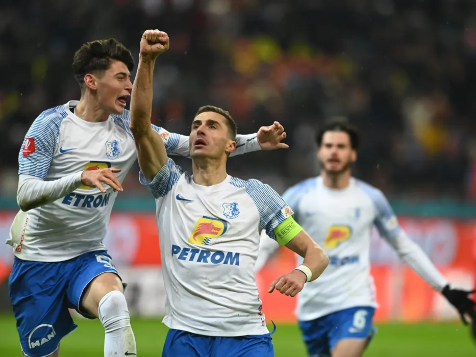 Fotbalistii constanteni Adrian Mazilu si Ionut Justinian Larie se bucura dupa un gol marcat in meciul de fotbal dintre FCSB si Farul Constanta, contand pentru Superliga Superbet, desfasurat pe Arena Nationala din Bucuresti, duminica 29 ianuarie 2023. © FOTO:Razvan Pasarica/SPORT PICTURES