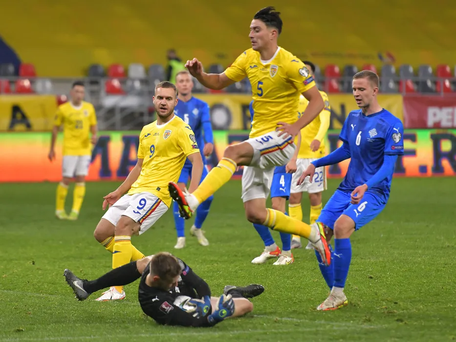 Elias Rafn Olafsson, George Puşcaş, Brynjar Ingi Bjarnason si Ionuţ Nedelcearu in meciul de fotbal dintre Romania si Islanda, din cadrul Preliminariilor Campionatului Mondial 2022, desfasurat pe Stadionul Steaua din Bucuresti, joi 11 noiembrie 2021. © FOTO:Razvan Pasarica/SPORT PICTURES