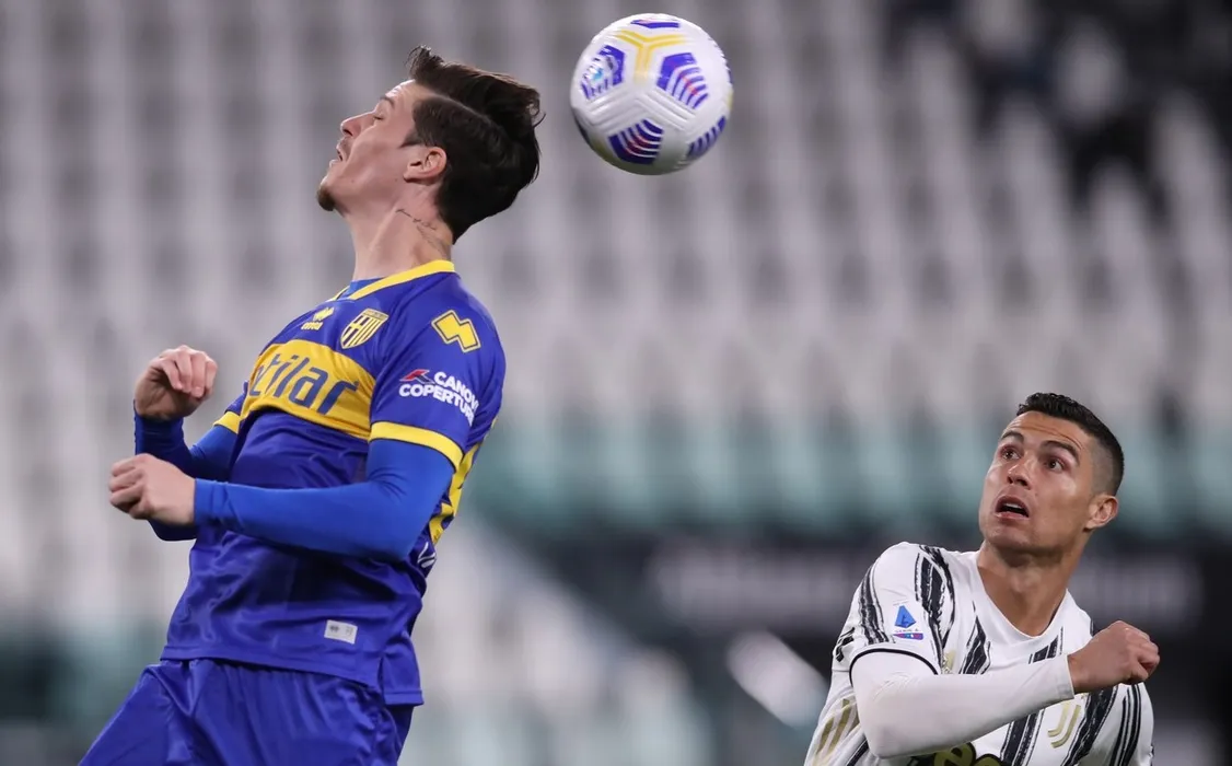 April 21, 2021, Turin, United Kingdom: Turin, Italy, 21st April 2021. Dennis Man of Parma Calcio heads the ball away from Cristiano Ronaldo of Juventus during the Serie A match at Allianz Stadium, Turin. Picture credit should read: Jonathan Moscrop / Sportimage,Image: 607116424, License: Rights-managed, Restrictions: , Model Release: no, Credit line: Profimedia