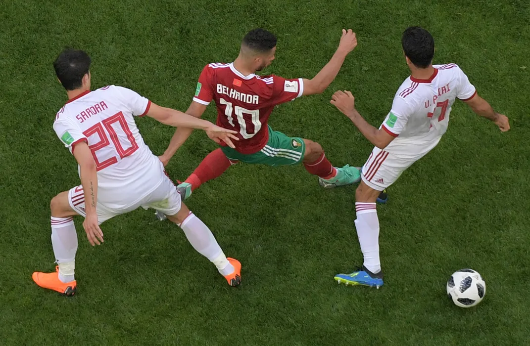 5533657 15.06.2018 From left: Iran's Sardar Azmoun, Morocco's Younes Belhanda and Iran's Vahid Amiri struggle for a ball during the World Cup Group B soccer match between Morocco and Iran at the St.Petersburg Arena, in St.Petersburg, Russia, June 15, 2018. Evgeny Biyatov / Sputnik