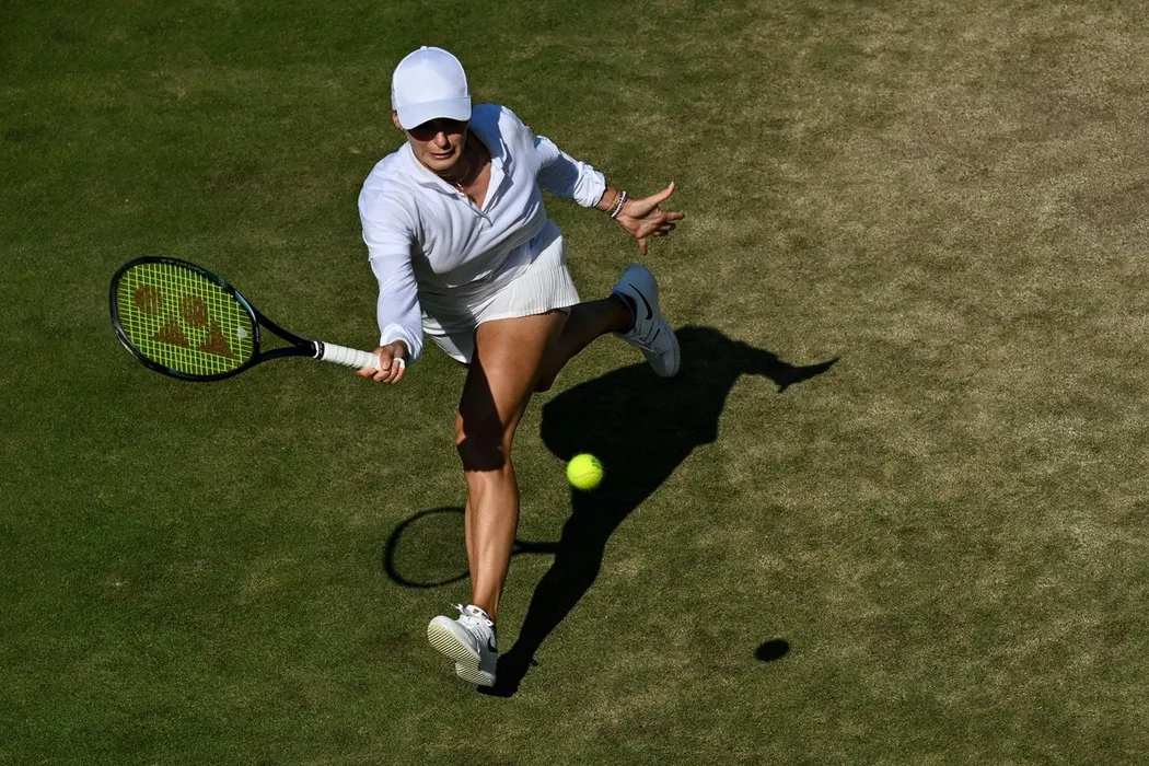 Romania's Ana Bogdan returns the ball to Ukraine's Lesia Tsurenko during their women's singles tennis match on the fifth day of the 2023 Wimbledon Championships at The All England Tennis Club in Wimbledon, southwest London, on July 7, 2023.,Image: 787742623, License: Rights-managed, Restrictions: RESTRICTED TO EDITORIAL USE, Model Release: no