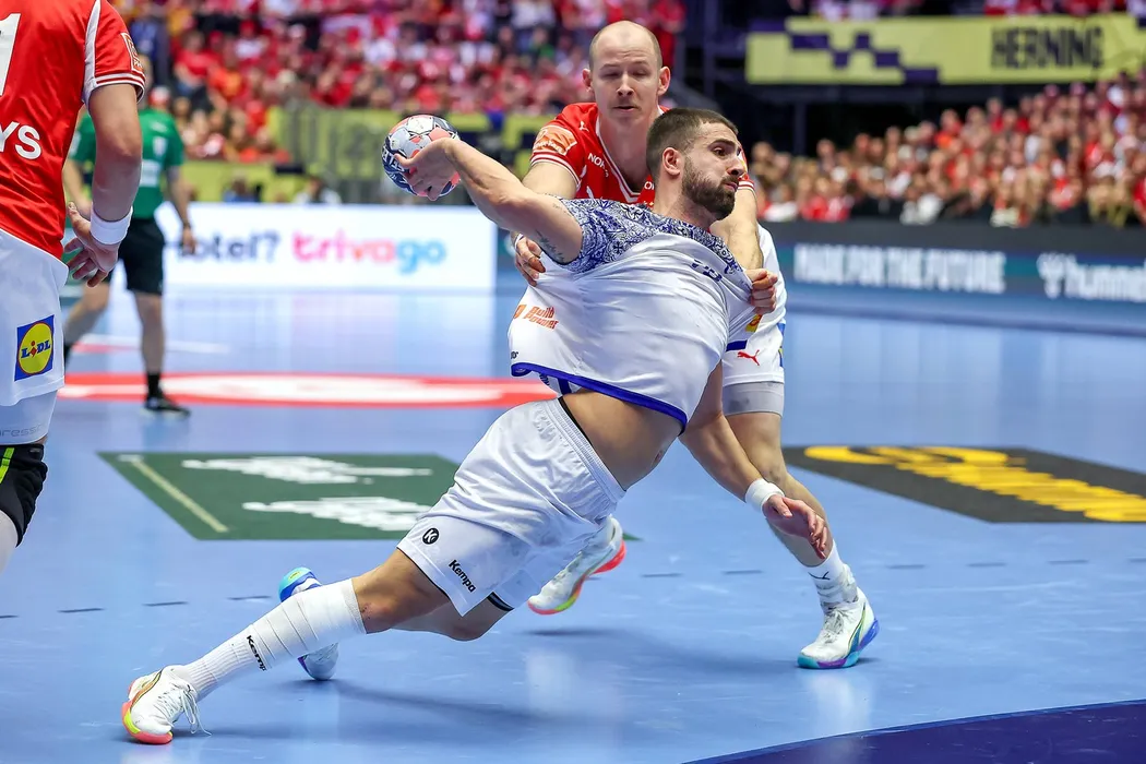 20.01.2026, Handball, Men s EHF EURO 2026, Dänemark - Portugal, Jyske Bank Boxen in Herning, Dänemark, Preliminary Round: Martim Mota Costa Portugal 79 im Zweikampf gegen Simon Hald Jensen Denmark 34 Dänemark *** 20 01 2026, Handball, Men s EHF EURO 2026, Denmark Portugal, Jyske Bank Boxing in Herning, Denmark, Preliminary Round Martim Mota Costa Portugal 79 in a duel against Simon Hald Jensen Denmark 34 Denmark,Image: 1067806589, License: Rights-managed, Restrictions: , Model Release: no, Credit line: Maximilian Koch / imago sportfotodienst / Profimedia