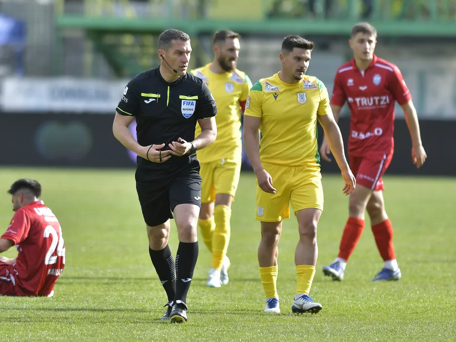 Arbitrul central Istvan Kovacs reactioneaza alaturi de Alexandru Daniel Buziuc in meciul de fotbal dintre CS Mioveni si FC Botosani, contand pentru Play-out-ul Ligii 1 Casa Pariurilor, desfasurat pe Stadionul Orasenesc din Mioveni, luni 2 mai 2022. © FOTO:Razvan Pasarica/SPORT PICTURES