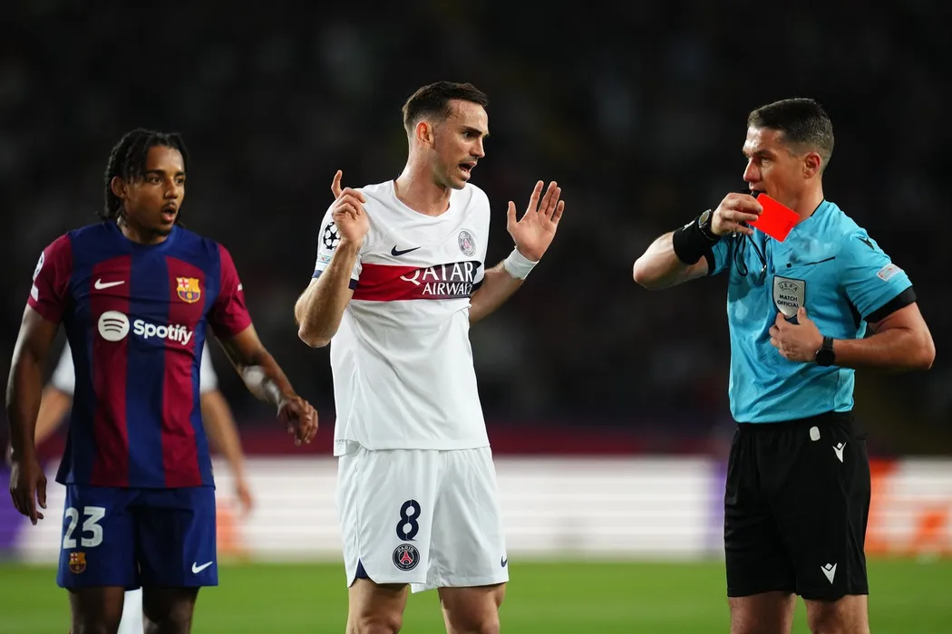 The referee shows red card to Ronald Araujo of FC Barcelona during the UEFA Champions League match, Quarter-finals, second leg, between FC Barcelona v Paris Saint Germain PSG played at Lluis Companys Stadium on April 16, 2024 in Barcelona Spain.,Image: 865402424, License: Rights-managed, Restrictions: World Rights Except Japan, Spain, France and The Netherlands * ESPOUT FRAOUT JPNOUT NLDOUT, Model Release: no