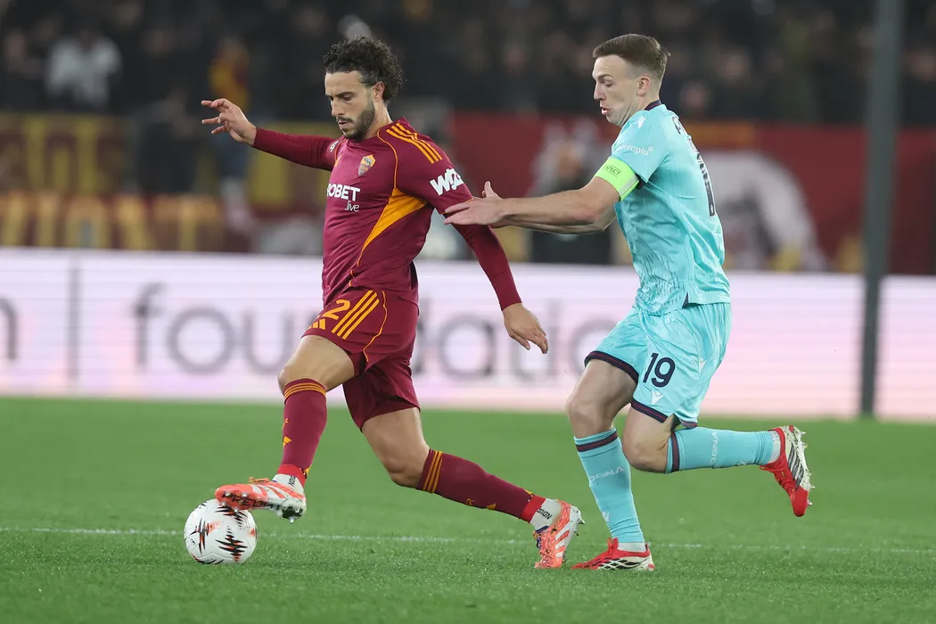 19 March 2026, Italy, Rome: AS Roma's Mario Hermoso (L) and Bologna's Lewis Ferguson battle for the ball during the UEFA Europe League Round of 16 second leg soccer match between AS Roma and Bologna FC 1909 at Stadio Olimpico. Photo: Marco Iacobucci/LiveMedia-IPA/ZUMA Press Wire/dpa