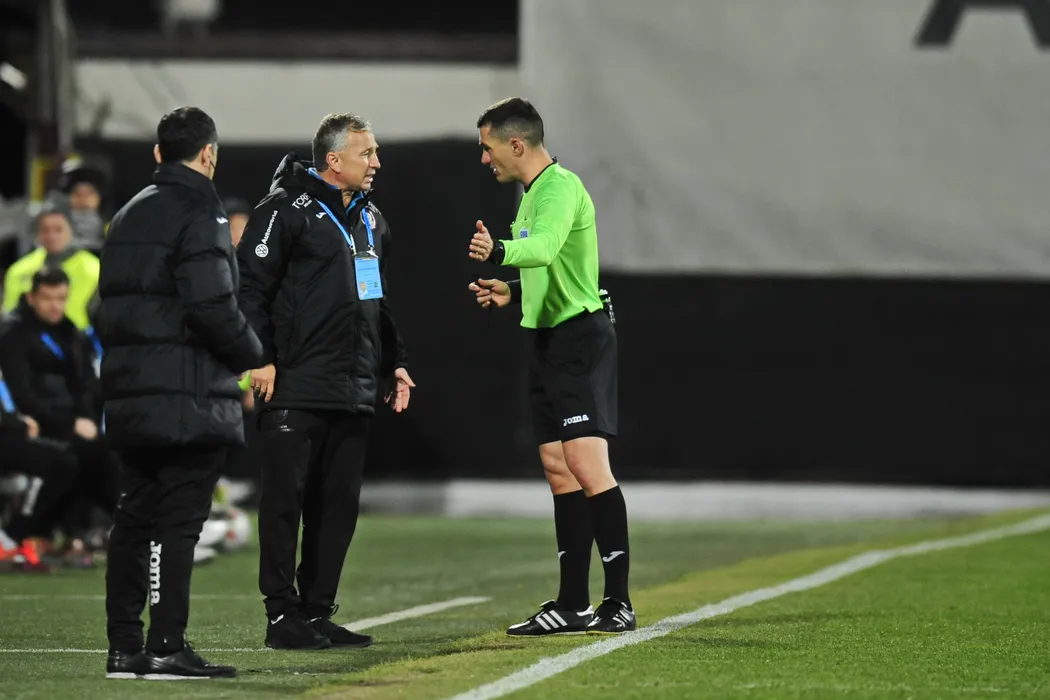 Dan Petrescu, antrenorul echipei CFR Cluj, discuta cu arbitrul Istvan Kovacs in timpul meciului de fotbal contra echipei FCSB din etapa a XXIII-a a Ligii 1, disputat pe stadionul Constantin Radulescu din Cluj-Napoca, duminica, 2 februarie 2020. DAN HORIA TAUTAN / MEDIAFAX FOTO