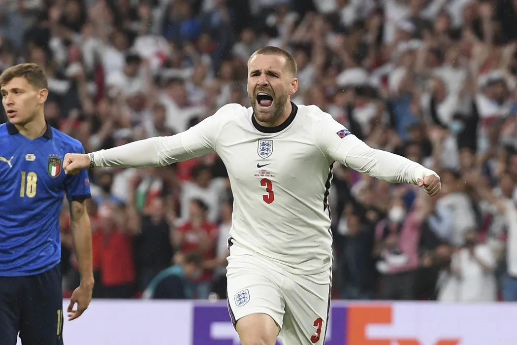 England's Luke Shaw, right, celebrates after scoring his side's opening goal during the Euro 2020 soccer final match between England and Italy at Wembley stadium in London, Sunday, July 11, 2021. (Andy Rain/Pool Photo via AP)