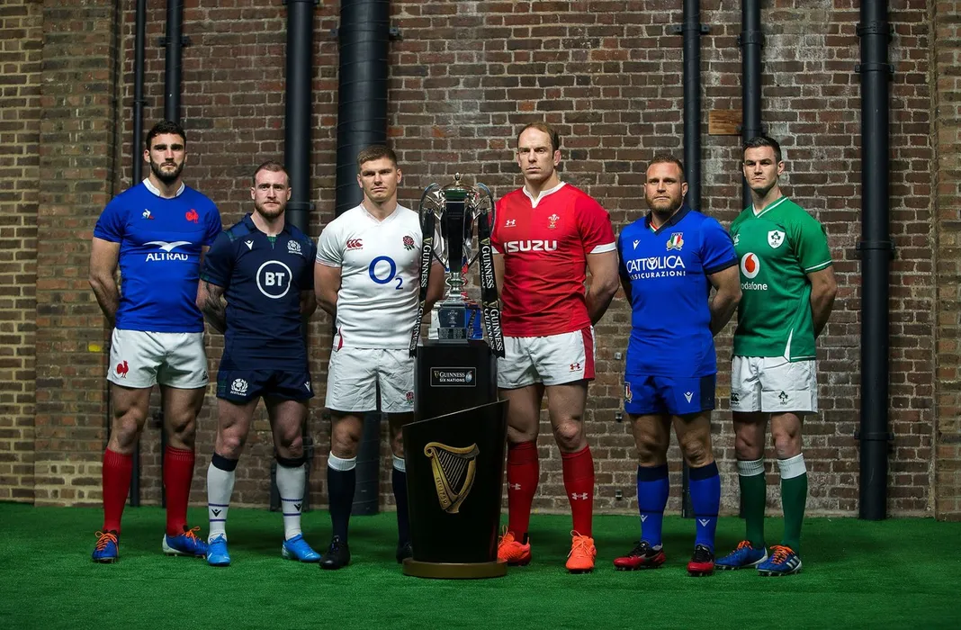 Charles Ollivon of France, Stuart Hogg of Scotland, Owen Farrell of England, Alun Wyn Jones of Wales, Luca Bigi of Italy and Jonathan Sexton of Ireland during the 2020 Guinness Six Nations Launch at Tobacco Dock, London.