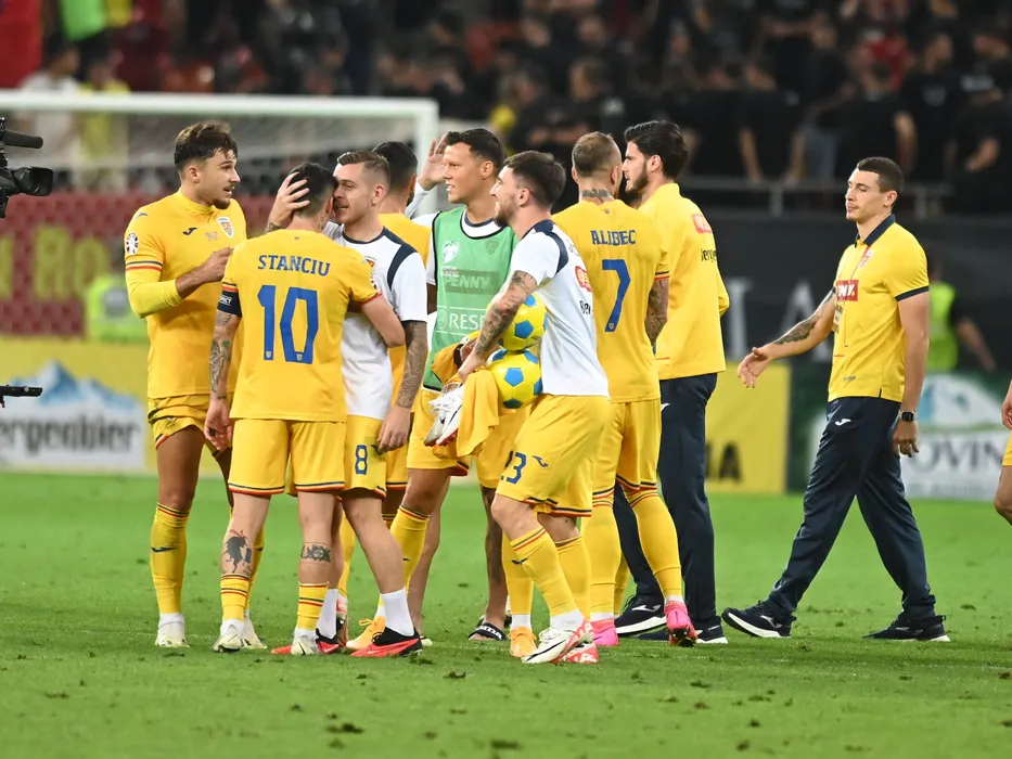 Bucurie romaneasca cu Andrei Ratiu, Nicolae Stanciu, Alexandru Cicaldau, Adrian Rus si Deian Sorescu dupa meciul de fotbal dintre Romania si Kosovo, din cadrul preliminariilor Campionatului European 2024, desfasurat pe Arena Nationala, marti 12 septembrie 2023. © FOTO:Razvan Pasarica/SPORT PICTURES