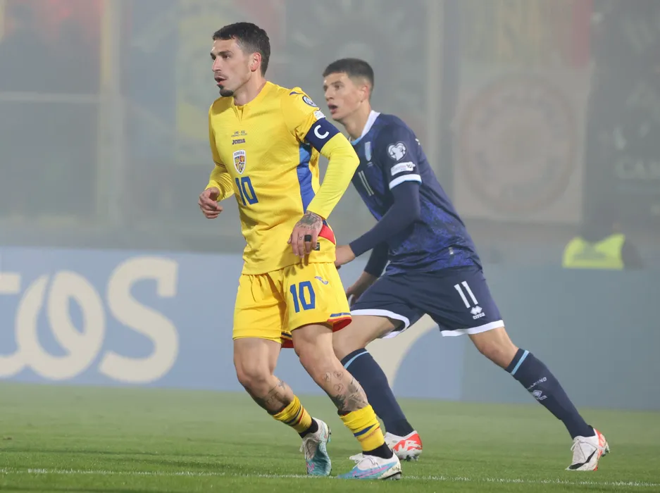 Nicolae Stanciu si Andrea Contadini in meciul de fotbal dintre San Marino si Romania, contand pentru Preliminariile Campionatului Mondial 2026 , desfasurat pe San Marino Stadium din Serravalle, luni 24 martie 2025. © FOTO: SPORT PICTURES