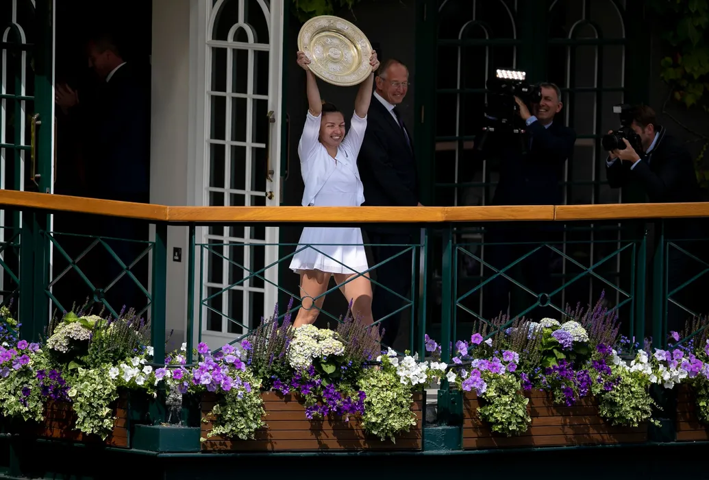 LONDON, April 2, 2020 -- File photo taken on July 13, 2019 shows Simona Halep of Romania celebrating at the club's balcony after winning the women's singles final match with Serena Williams of the United States at the 2019 Wimbledon Tennis Championships in London, Britain. This year's Wimbledon has been cancelled due to the public health concerns related to the ongoing COVID-19 pandemic, the All England Club (AELTC) announced after an emergency meeting on Wednesday.,Image: 511379608, License: Rights-managed, Restrictions: , Model Release: no