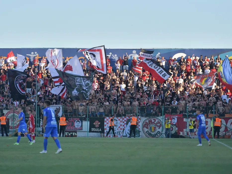 Galeria dinamovista cu steaguri prezenta in peluza la meciul de fotbal dintre Chindia Targoviste si Dinamo Bucuresti, contand pentru Liga 1 Casa Pariurilor, desfasurat pe Stadionul Gloria din Buzau, duminica 8 august 2021. © FOTO:Razvan Pasarica/SPORT PICTURES