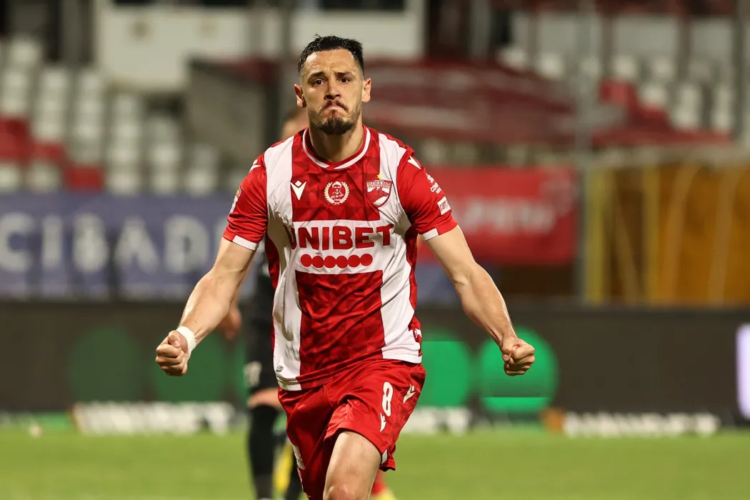 Paul Anton, de la FC Dinamo, isi manifesta bucuria dupa ce a inscris un gol in timpul meciului de fotbal contra echipei AFC Hermannstadt din etapa 7 a play-off-ului Ligii 1, disputat pe stadionul Dinamo din Bucuresti, sambata, 8 mai 2021. GEORGE FILIP / MEDIAFAX FOTO