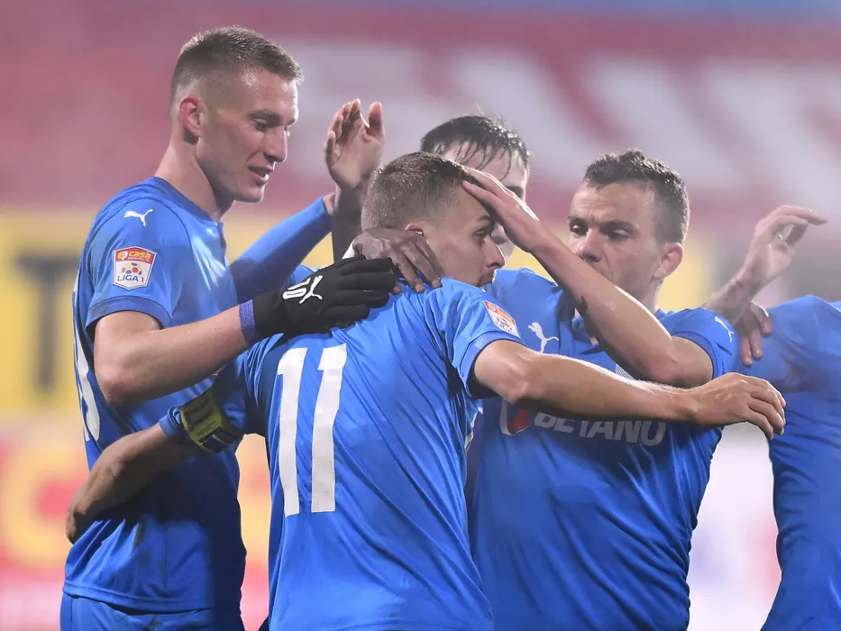 Bucurie a fotbalistilor craioveni Ivan Mamut, Nicusor Silviu Bancu si Dan Nicolae Nistor dupa un gol marcat in meciul de fotbal dintre FC Hermannstadt si Universitatea Craiova, contand pentru Liga 1 Casa Pariurilor, desfasurat fara spectatori pe Stadionul Municipal din Medias, sambata 31 octombrie 2020. © FOTO:Razvan Pasarica/SPORT PICTURES