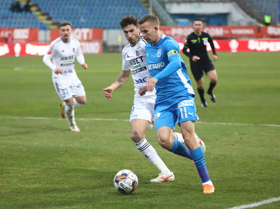 Nicușor Silviu Bancu și Ioan Constantin Filip în meciul de fotbal dintre AFC Botoșani și Universitatea Craiova, contând pentru SUPERLIGA SUPERBET, desfășurat pe Stadionul Municipal din Botoșani, duminică 18 februarie 2024. © FOTO: Ionuț TABULTOC/SPORT PICTURES