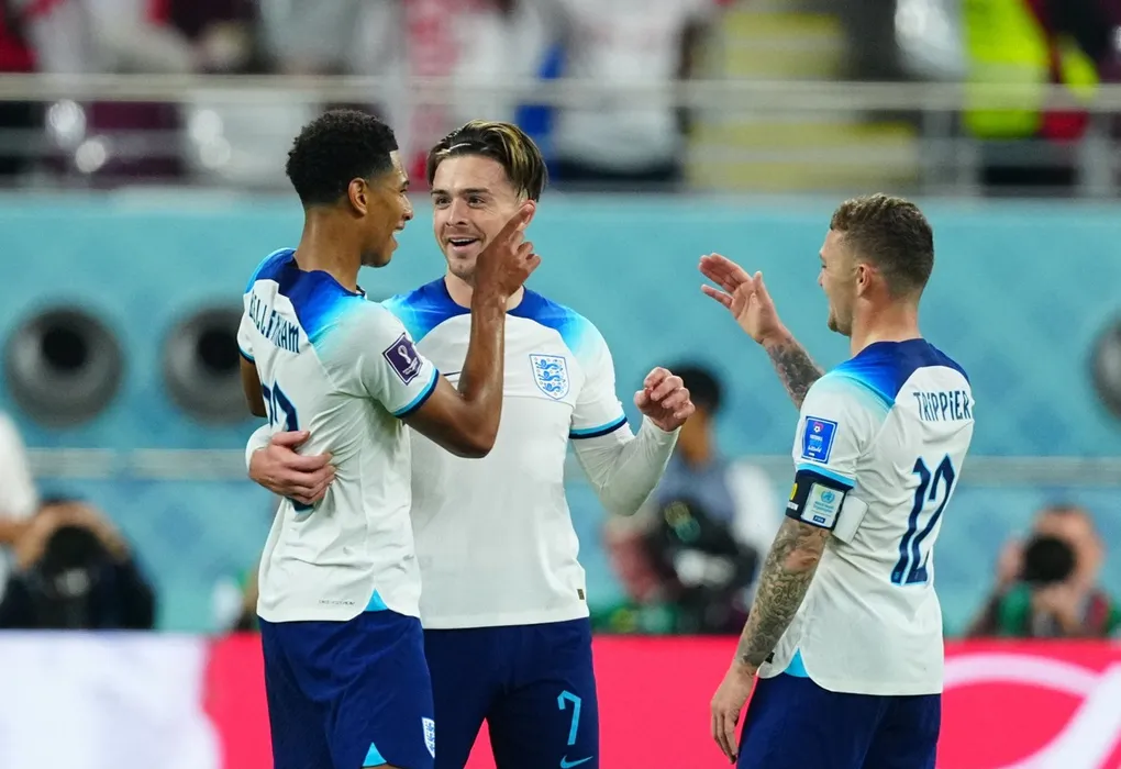 Jack Grealish of England celebrates his goal. England v Iran, FIFA World Cup 2022, Group B, Football, Khalifa International Stadium, Ar-Rayyan, Qatar - 21 Nov 2022,Image: 739146265, License: Rights-managed, Restrictions: Editorial Use Only, Model Release: no