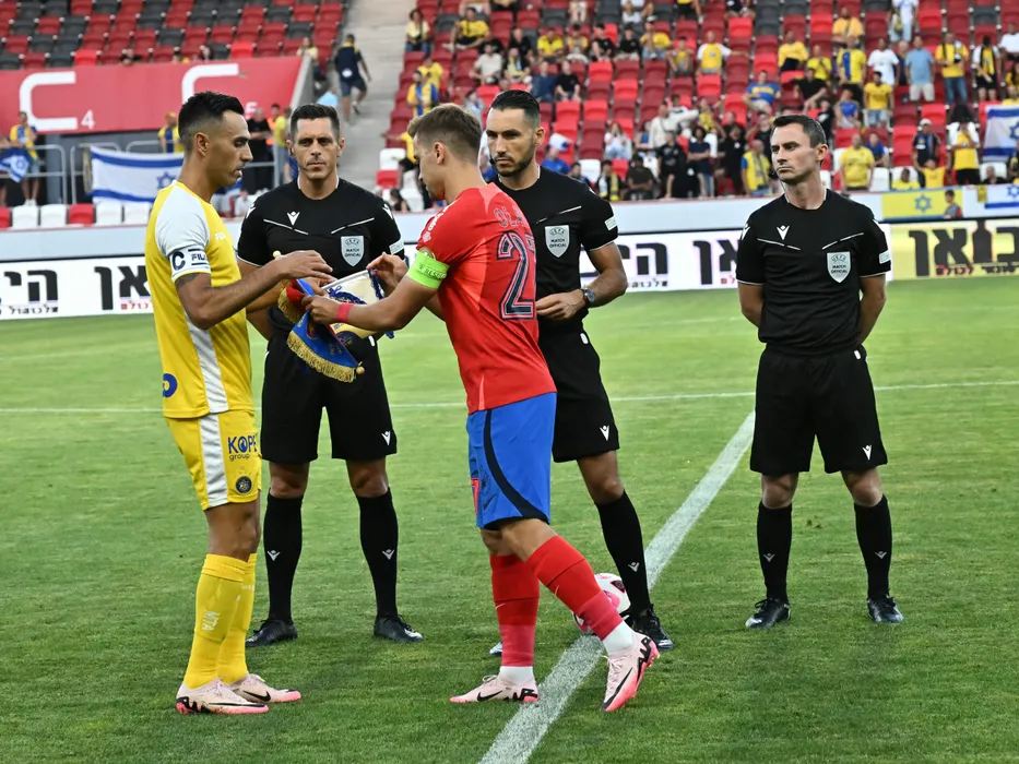 Brigada de arbitrii formată din Aurélien Drouet, Jérémie Pignard si Laurent Coniglio alături de căpitanii Eran Zahavi si Darius Dumitru Olaru in meciul dintre Maccabi Tel Aviv FC si FCSB, contand pentru Preliminariile Ligii Campionilor, desfasurat pe Bozsik Arena din Budapesta, miercuri 31 iulie 2024. © FOTO:Razvan Pasarica/SPORT PICTURES