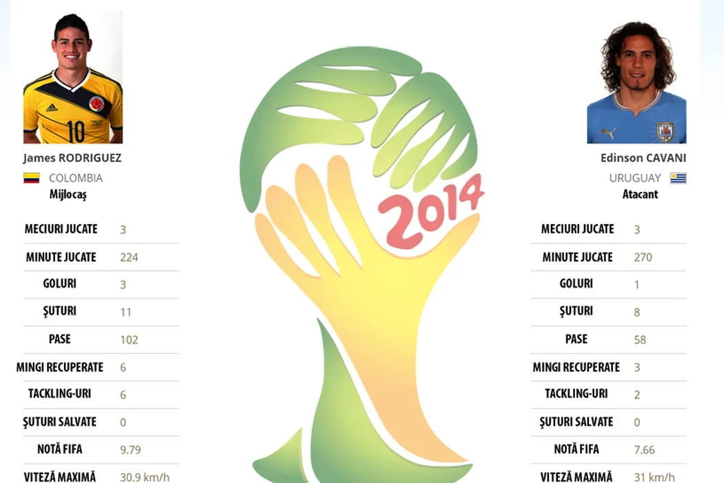 James vs Edinson, duelul starurilor din Columbia – Uruguay. Rodriguez a contribuit la cinci goluri ale țării sale, în timp ce Cavani a marcat o singură dată