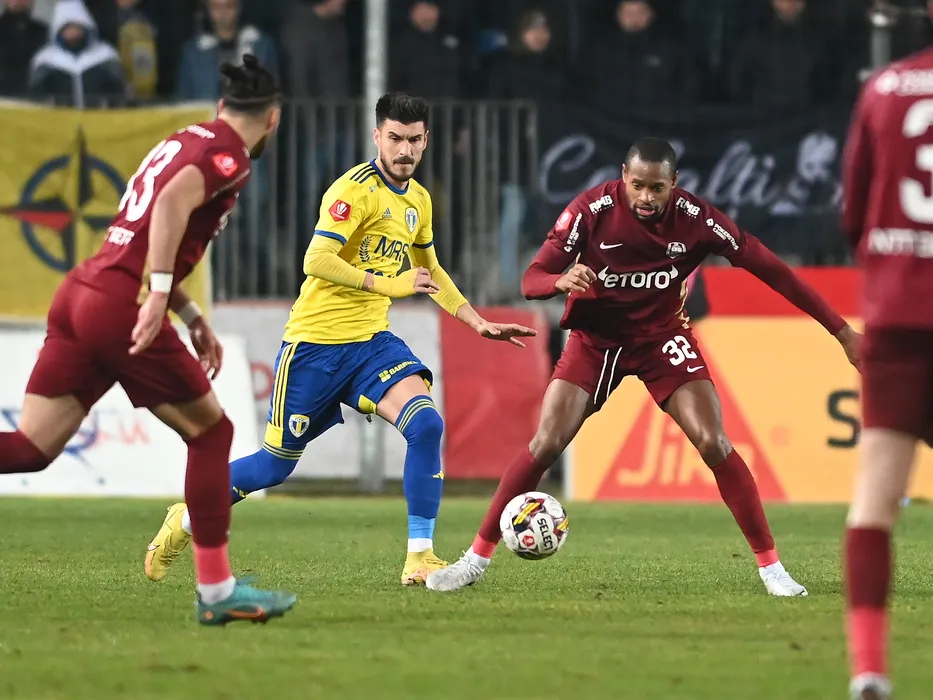 Cosmin Florin Achim si Rangelo Maria Janga in meciul de fotbal dintre Petrolul Ploiesti si CFR Cluj, contand pentru Superliga Superbet, desfasurat pe Stadionul Ilie Oana din Ploiesti, luni 27 februarie 2023. © FOTO:Razvan Pasarica/SPORT PICTURES