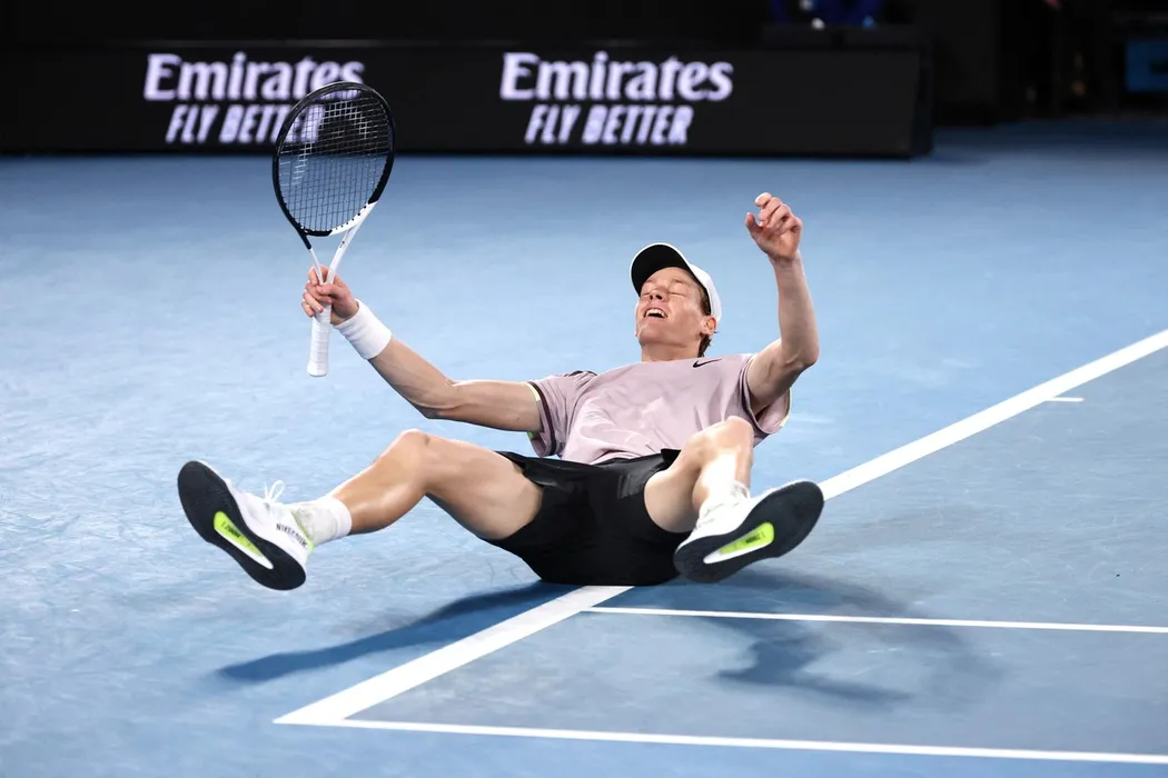 Italy's Jannik Sinner celebrates match point against Russia's Daniil Medvedev during their men's singles final match on day 15 of the Australian Open tennis tournament in Melbourne on January 28, 2024.,Image: 841290750, License: Rights-managed, Restrictions: -- IMAGE RESTRICTED TO EDITORIAL USE - STRICTLY NO COMMERCIAL USE --, Model Release: no
