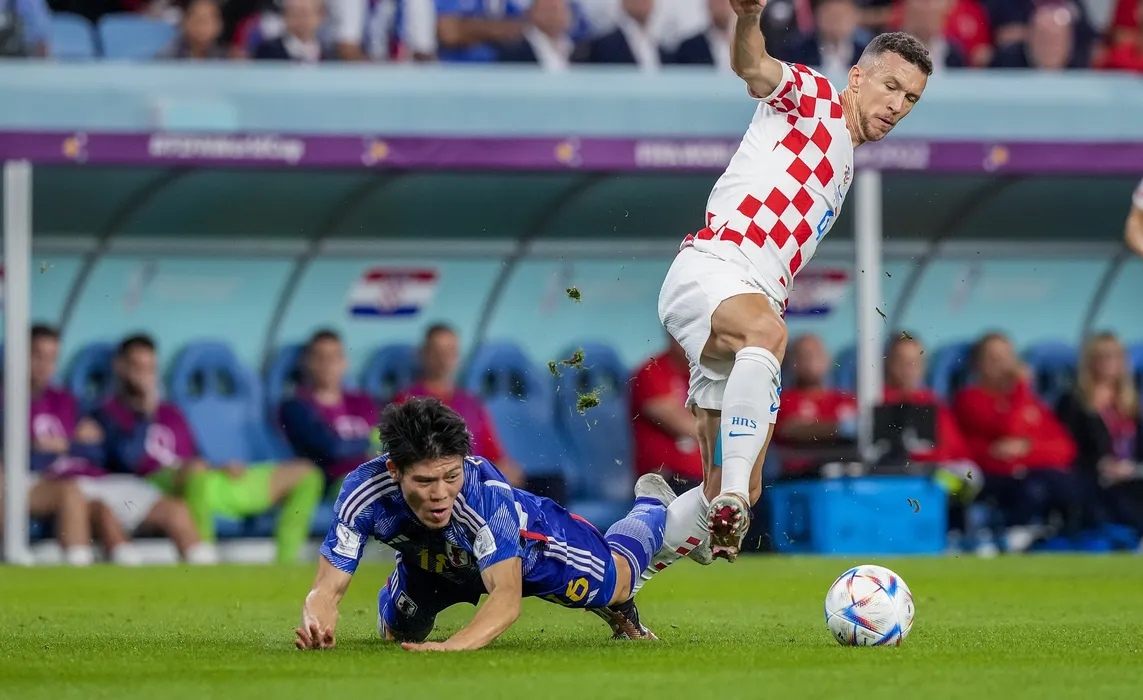 AL-WAKRAH, 05-12-2022, Al Janoub Stadium, World Cup 2022 in Qatar game between Japan and Croatia, Japan player Takehiro Tomiyasu, Kroatie player Ivan Perisic,Image: 742455464, License: Rights-managed, Restrictions: World Rights Except Austria and The Netherlands * AUTOUT NLDOUT, Model Release: no