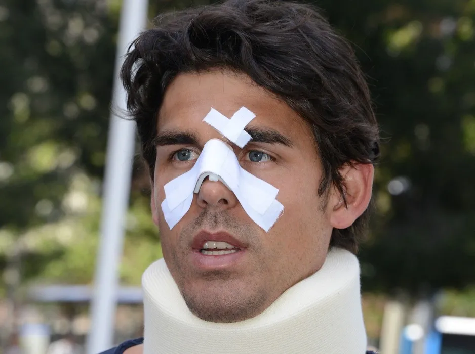 Tennis player Thomas Drouet of Monaco, training partner of Australian tennis player Bernard Tomic, leaves a court house bandaged and wearing a kneck brace in Madrid on May 6, 2013. Drouet was allegedly headbutted by Tomic's father and coach, John Tomic, during an altercation on May 4, 2013 in Madrid. The court set a May 14 hearing for a judge to decide John Tomic's guilt or innocence.,Image: 160933235, License: Rights-managed, Restrictions: , Model Release: no