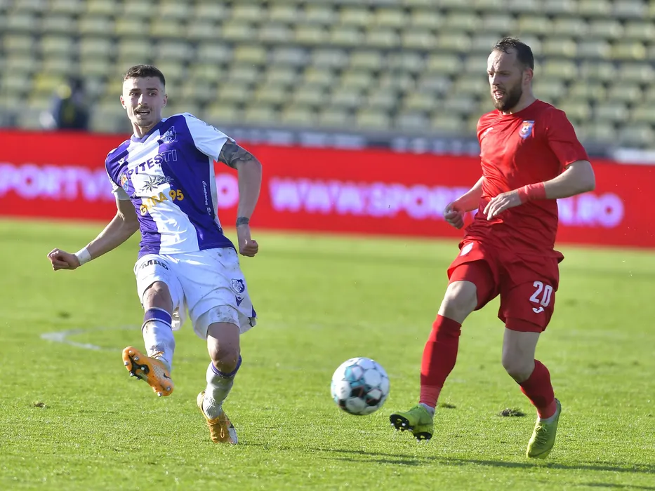 Grigore Ioan Turda si Cristian Daniel Negut in meciul de fotbal dintre FC Arges si Chindia Targoviste, contand pentru Play-out-ul Ligii 1 Casa Pariurilor, desfasurat fara spectatori pe Stadionul Nicolae Dobrin din Pitesti, miercuri 21 aprilie 2021. © FOTO:Razvan Pasarica/SPORT PICTURES