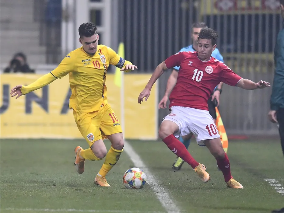Ianis Hagi si Victor Jensen in meciul de fotbal dintre Romania U21 si Danemarca U21, din cadrul Preliminariilor Campionatului European din 2021, desfasurat fara spectatori pe Stadionul Ilie Oana din Ploiesti, marti 17 noiembrie 2020. © FOTO:Razvan Pasarica/SPORT PICTURES
