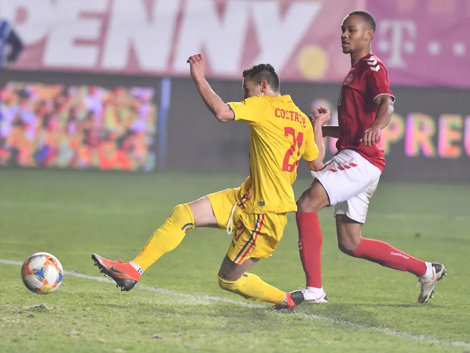 Ionut Valentin Costache marcheaza un gol de langa Nikolas Nartey in meciul de fotbal dintre Romania U21 si Danemarca U21, din cadrul Preliminariilor Campionatului European din 2021, desfasurat fara spectatori pe Stadionul Ilie Oana din Ploiesti, marti 17 noiembrie 2020. © FOTO:Razvan Pasarica/SPORT PICTURES