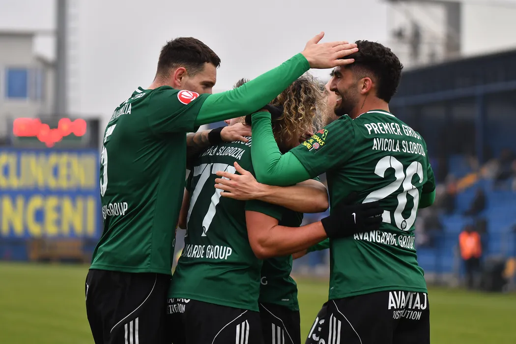 Fotbalistii ialomiteni se bucura dupa un gol marcat de Torres Renato Espinosa in meciul de fotbal dintre Metaloglobus Bucuresti si AFC UNIREA 04 Slobozia, contand pentru Superliga Superbet, desfasurat pe Clinceni Arena din Clinceni, sambata 20 decembrie 2025. © FOTO:Daniel George Ilinca/SPORT PICTURES