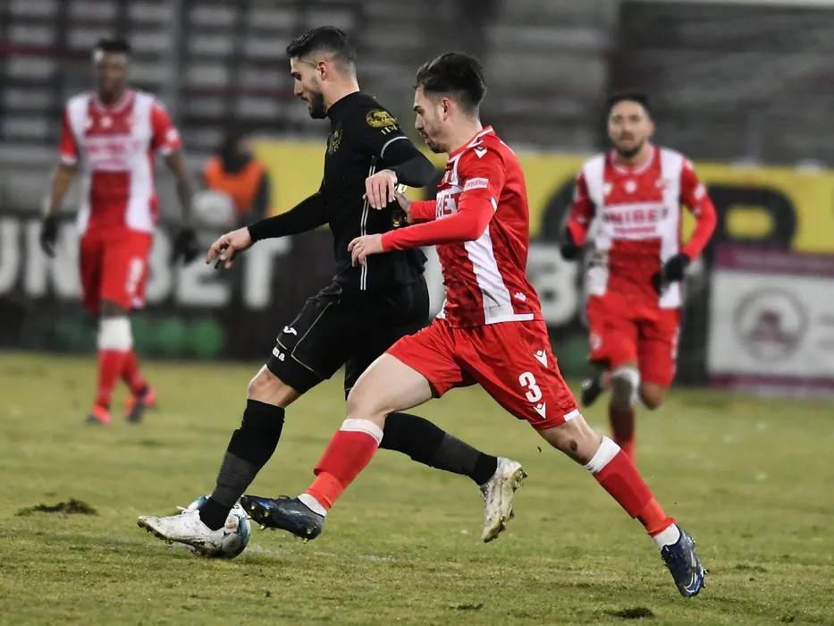 Ricardo Jorge Oliveira Valente si Andrei Radu in meciul de fotbal dintre Dinamo Bucuresti si Gaz Metan Medias, contand pentru Liga 1 Casa Pariurilor, desfasurat fara spectatori pe Stadionul Dinamo din Bucuresti, miercuri 27 ianuarie 2021. © FOTO:Razvan Pasarica/SPORT PICTURES