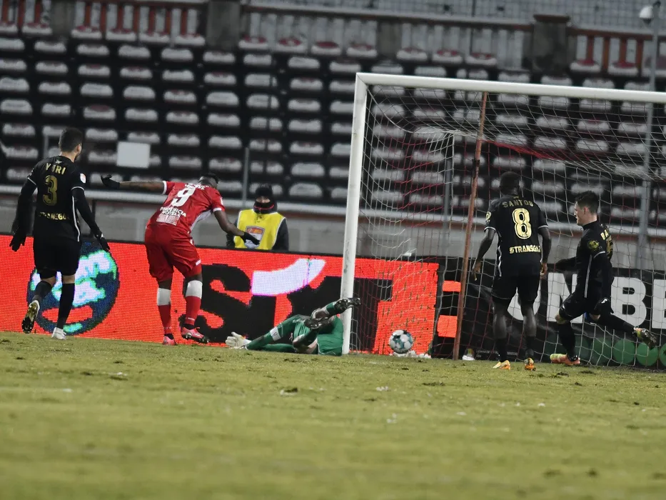 Magaye Serigne Gueye marcheaza un gol in poarta lui Razvan Nicolae Plesca in meciul de fotbal dintre Dinamo Bucuresti si Gaz Metan Medias, contand pentru Liga 1 Casa Pariurilor, desfasurat fara spectatori pe Stadionul Dinamo din Bucuresti, miercuri 27 ianuarie 2021. © FOTO:Razvan Pasarica/SPORT PICTURES