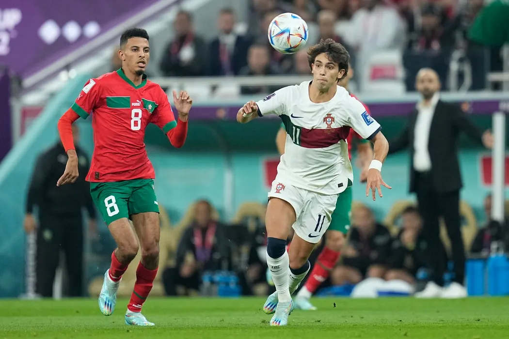 Morocco's Azzedine Ounahi, left, and Portugal's Joao Felix run for the ball during the World Cup quarterfinal soccer match between Morocco and Portugal, at Al Thumama Stadium in Doha, Qatar, Saturday, Dec. 10, 2022.,Image: 743774094, License: Rights-managed, Restrictions: This content is intended for editorial use only. For other uses, additional clearances may be required., Model Release: no, Pictured: A. Ounahi,Joao Felix