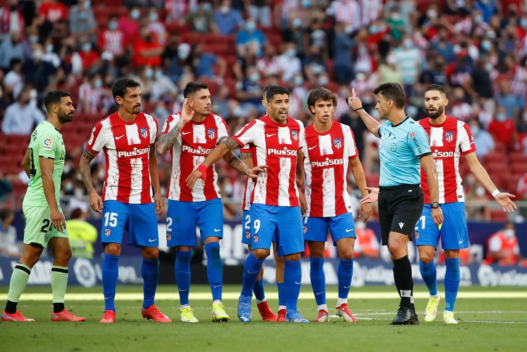 Referee shows red card to Joao Felix of Atletico de Madrid during the La Liga match between Atletico de Madrid and Athletic Club Bilbao at Wanda Metropolitano Stadium in Madrid, Spain.