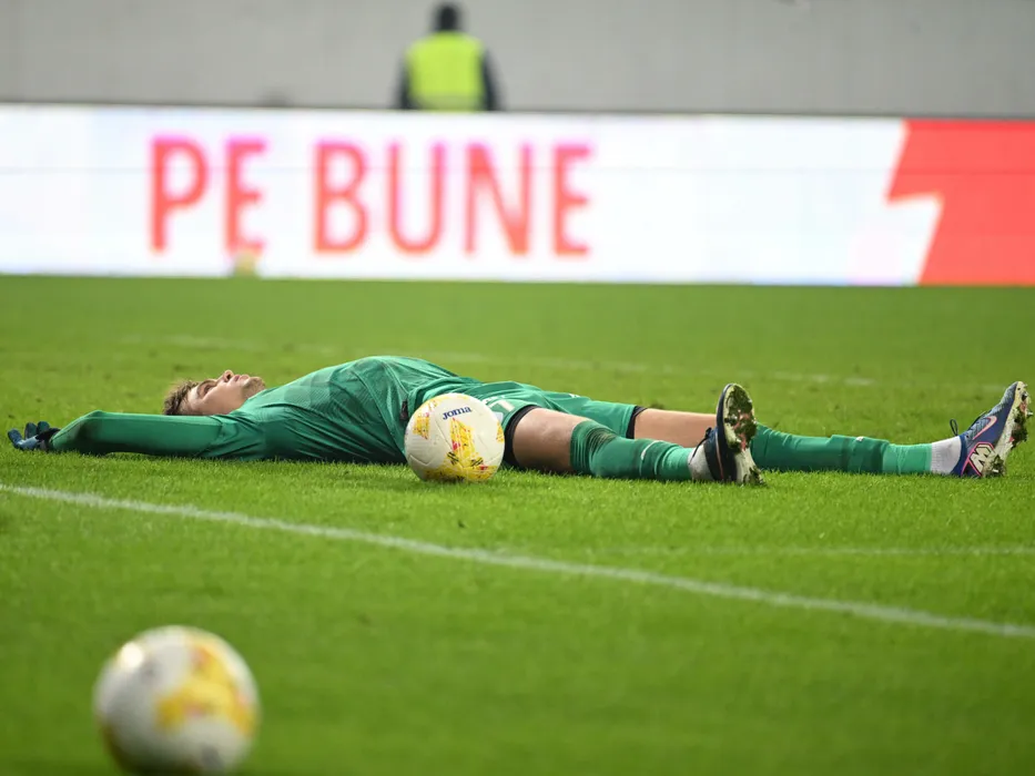 Pavlo Isenko, la pamant, se bucura dupa meciul de fotbal dintre Universitatea Craiova si CFR Cluj, contand pentru Cupa Romaniei Betano, desfasurat pe Stadionul Ion Oblemenco din Craiova, miercuri 4 martie 2026. © FOTO:Razvan Pasarica/SPORT PICTURES