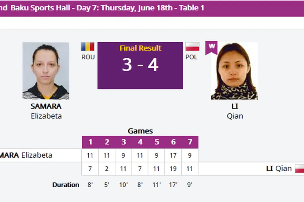 Jocurile Europene de la Baku | Ziua a șasea. Samara a ratat dramatic sferturile la tenis de masă. Iridon i-a lăsat locul în finala de individual compus Laurei Jurcă, iar gimnasta și-a încheiat evoluția fără vreo notă de 14,000. Cotuna, ultimul în finala masculină