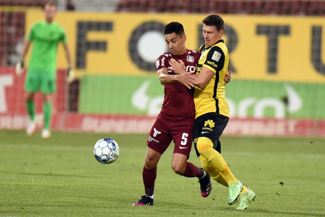 Jonathan Rodriguez (S), de la CFR Cluj, suteaza in timpul meciului de fotbal contra echipei Young Boys din turul 3 preliminar al Ligii Campionilor, disputat pe stadionul Dr. Constantin Radulescu, marti, 3 august 2021. DAN HORIA TAUTAN / MEDIAFAX FOTO
