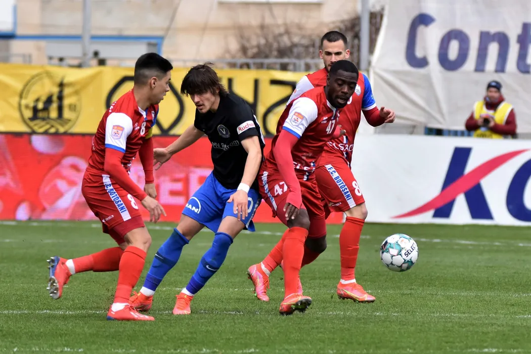 Jonathan Rodriguez (S), de la FC Botosani, lupta pentru balon cu Alexi Pitu (C), de la FC Viitorul, in meciul de fotbal din etapa 29 a Ligii 1, disputat pe stadionul Municipal din Botosani, duminica, 4 aprilie 2021. DRAGOS PASCANEANU / MEDIAFAX FOTO