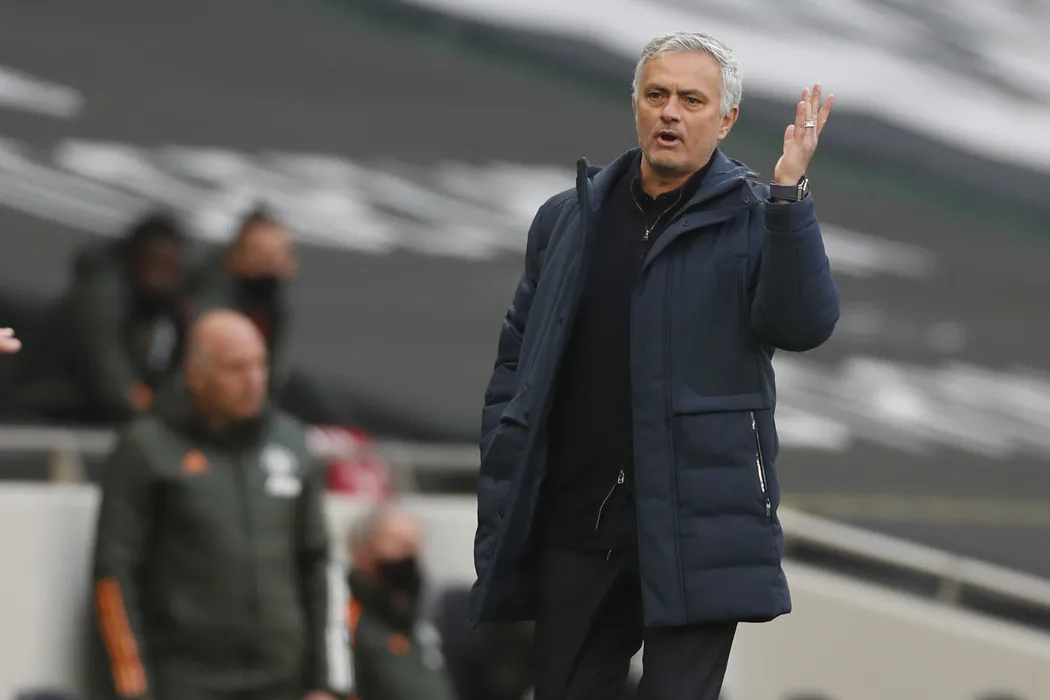 Tottenham's manager Jose Mourinho reacts during the English Premier League soccer match between Tottenham Hotspur and Manchester United at the Tottenham Hotspur Stadium in London, Sunday, April 11, 2021. (Matthew Childs/Pool via AP)