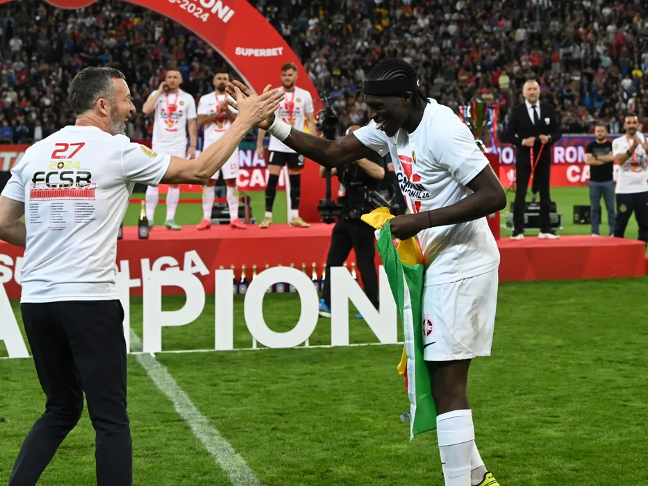 Mihai Stoica si Joyskim Aurelien Dawa Tchakonte celebreaza castigarea Superligii in urma meciului dintre FCSB si CFR Cluj, desfășurat pe Arena Nationala din Bucuresti, sambata 11 mai 2024. © FOTO: Razvan Pasarica/SPORT PICTURES
