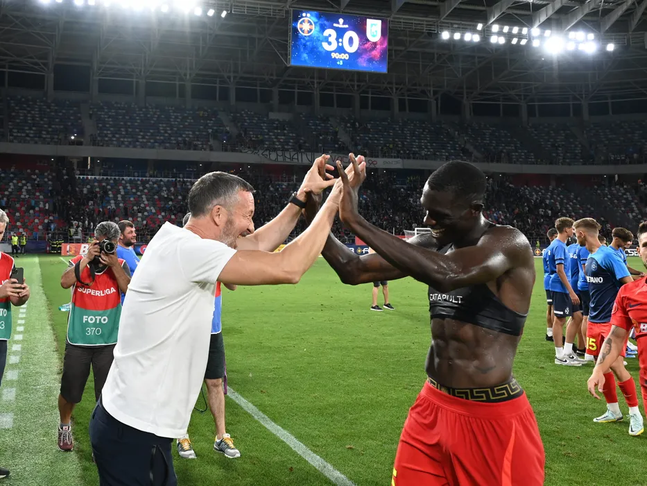 Mihai Stoica il felicita pe Joyskim Aurelien Dawa Tchakonte alaturi de tabela de marcaj dupa meciul de fotbal dintre FCSB si Universitatea Craiova, din cadrul Superligii Superbet, desfasurat pe Stadionul Steaua-Ghencea din Bucuresti, sambata 2 septembrie 2023. © FOTO:Razvan Pasarica/SPORT PICTURES
