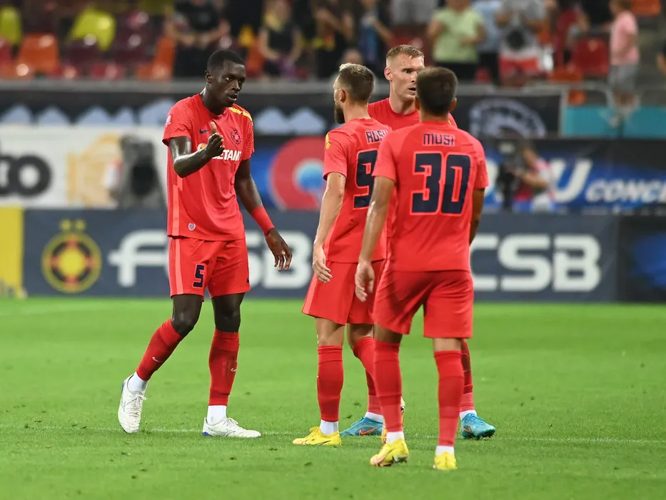 Bucurie a fotbalistilor stelisti dupa un gol marcat cu Joyskim Aurelien Dawa Tchakonte si Joonas Tamm in meciul de fotbal dintre FCSB si FC Hermannstadt, contand pentru Superliga Superbet, desfasurat pe Arena Nationala din Bucuresti, duminica 28 august 2022. © FOTO:Razvan Pasarica/SPORT PICTURES