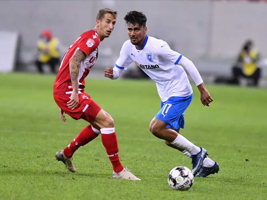 Juan Camara Mesa si Stefan Baiaram in meciul de fotbal dintre Dinamo Bucuresti si Universitatea Craiova, contand pentru Liga 1 Casa Pariurilor, desfasurat fara spectatori pe Arena Nationala din Bucuresti, duminica 18 octombrie 2020. © FOTO:Razvan Pasarica/SPORT PICTURES