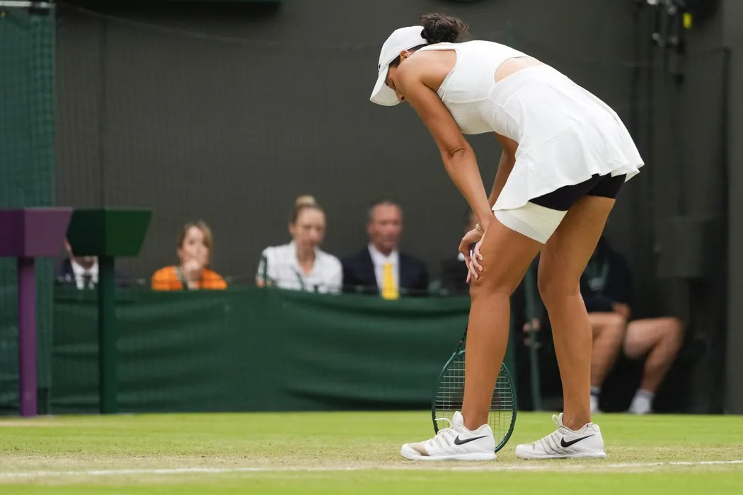 Madison Keys of the United States reacts during her fourth round match against Jasmine Paolini of Italy at the Wimbledon tennis championships in London, Sunday, July 7, 2024.,Image: 887995757, License: Rights-managed, Restrictions: This content is intended for editorial use only. For other uses, additional clearances may be required., Model Release: no, Pictured: Jasmine Paolini
