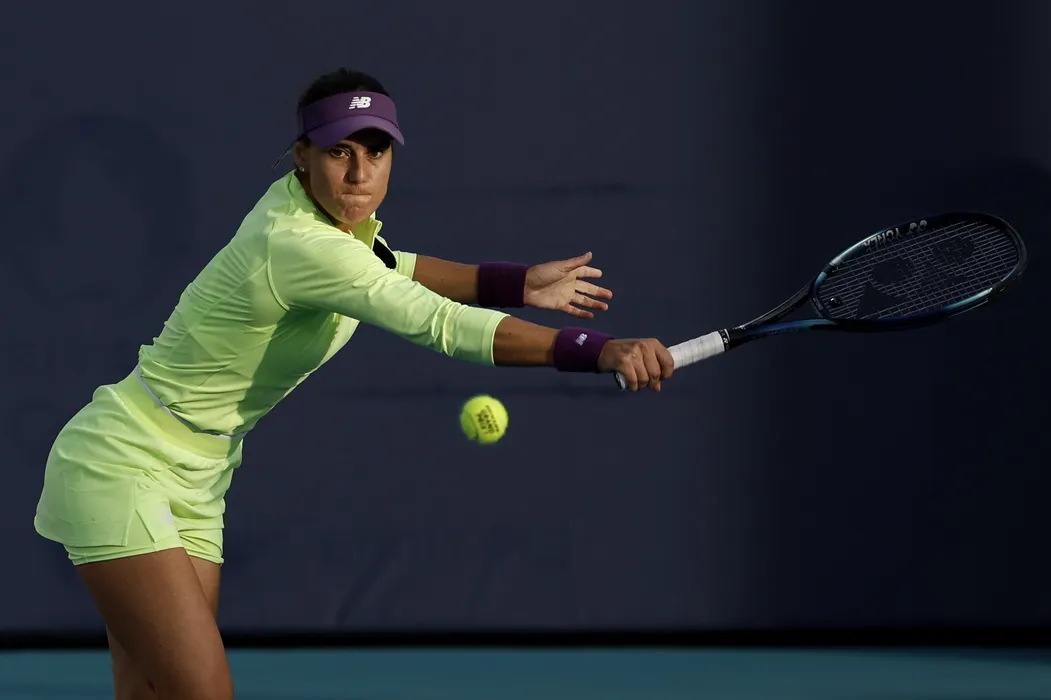 Mar 25, 2024; Miami Gardens, FL, USA; Sorana Cirstea (ROM) reaches for a backhand against Danelle Collins (USA) (not pictured) on day eight of the Miami Open at Hard Rock Stadium.,Image: 859596166, License: Rights-managed, Restrictions: *** World Rights ***, Model Release: no