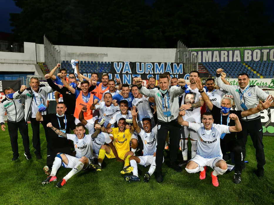 Fotbalistii si staff-ul Universitatii Craiova se bucura intr-o fotografie de grup realizata dupa victoria din meciul de fotbal impotriva celor de la FC Botosani, contand pentru play-off-ul Ligii 1 Casa Pariurilor, disputat fara spectatori pe Stadionul Municipal din Botosani, duminica 19 iulie 2020. © FOTO:Razvan Pasarica/SPORT PICTURES