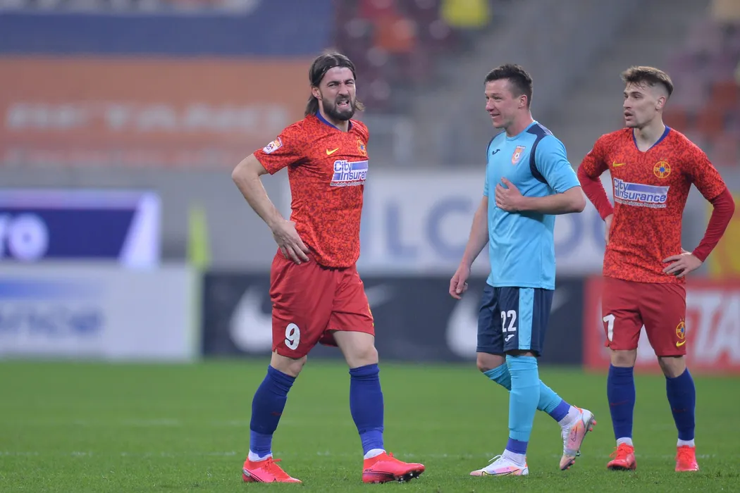 Ante Vukusic (S), de la FCSB, si Vadim Rata (C), de la Chindia Targoviste, reactioneaza in meciul de fotbal din etapa a XXIV-a a Ligii 1, disputat pe Arena Nationala din Bucuresti, sambata, 20 februarie 2021. ALEXANDRU DOBRE / MEDIAFAX FOTO
