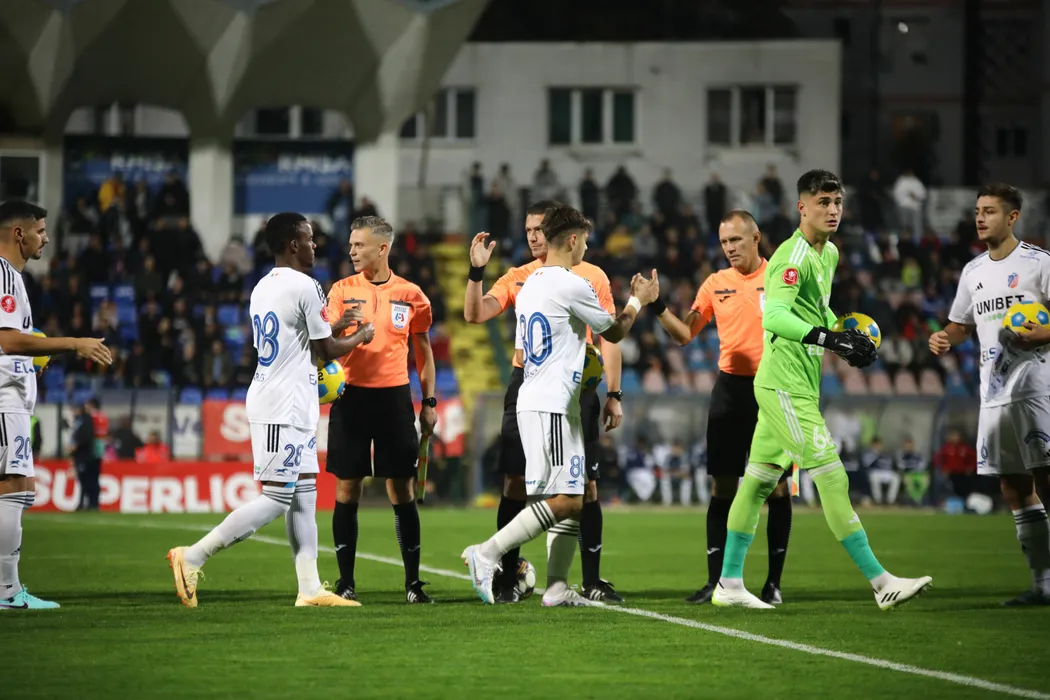 Echipele se salută la startul meciului de fotbal dintre FC BOTOȘANI și FC UNIVERSITATEA CLUJ, contând pentru SUPERLIGA SUPERBET, desfășurat pe Stadionul Municipal din Botoșani, luni 30 octombrie 2023. © FOTO: Ionuț TABULTOC/SPORT PICTURES