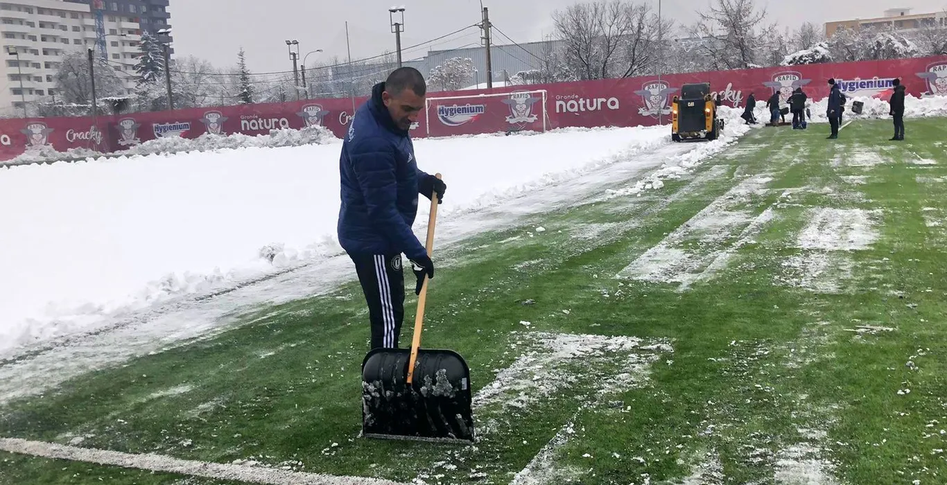 Jucătorii de la Rapid și U Cluj au dat împreună zăpada de pe teren! Costel Enache a trecut și el la lopată | FOTO & VIDEO EXCLUSIV