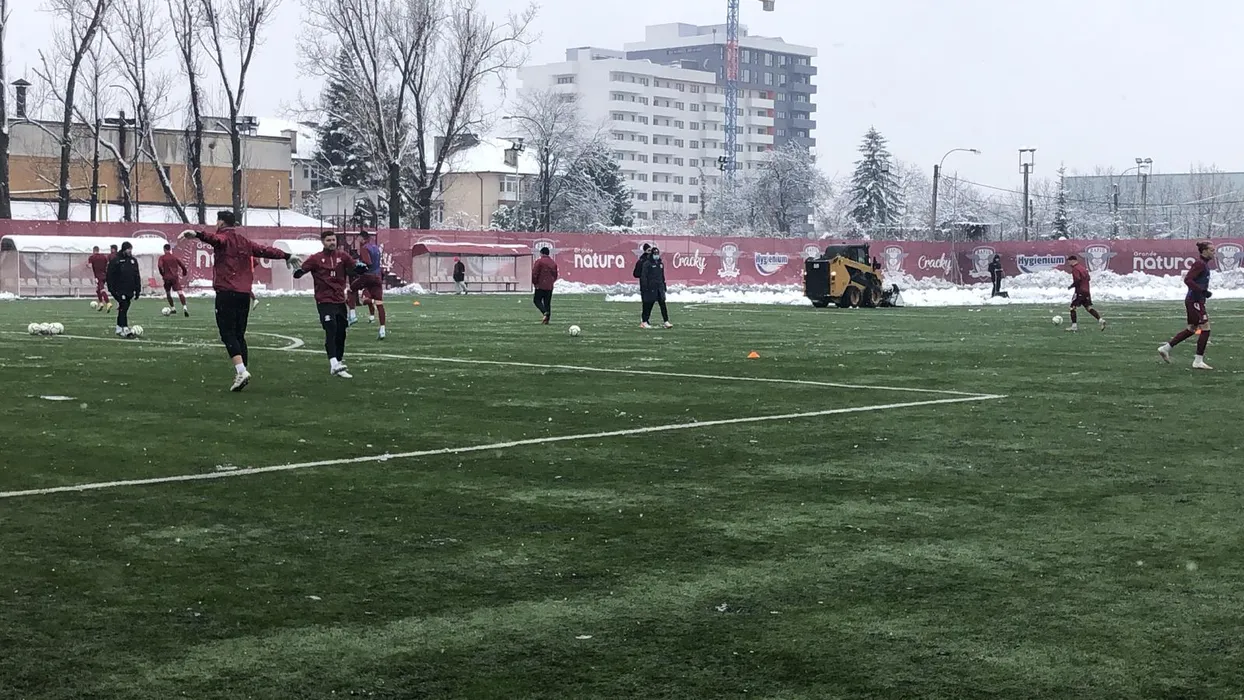 Jucătorii de la Rapid și U Cluj au dat împreună zăpada de pe teren! Costel Enache a trecut și el la lopată | FOTO & VIDEO EXCLUSIV